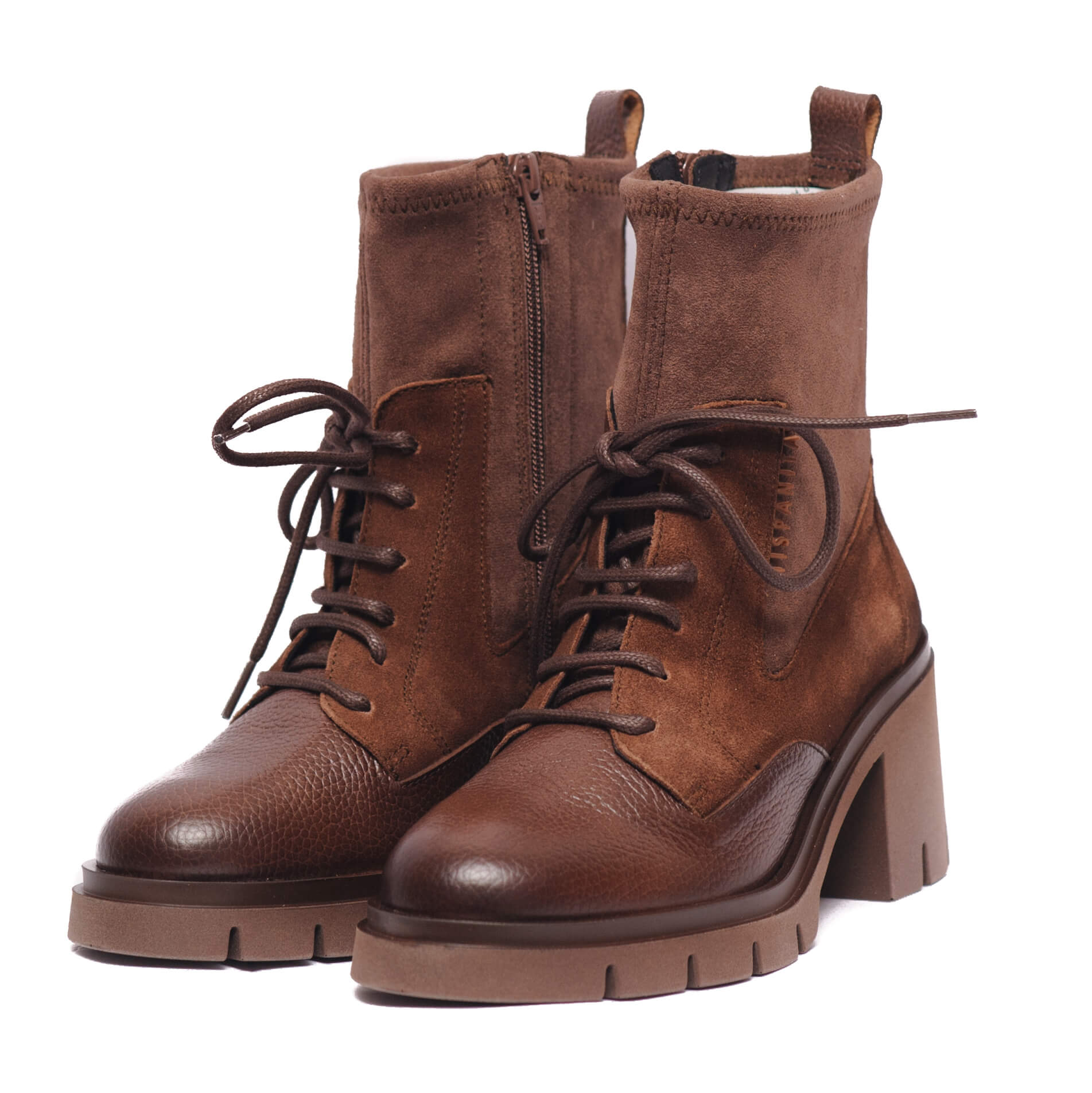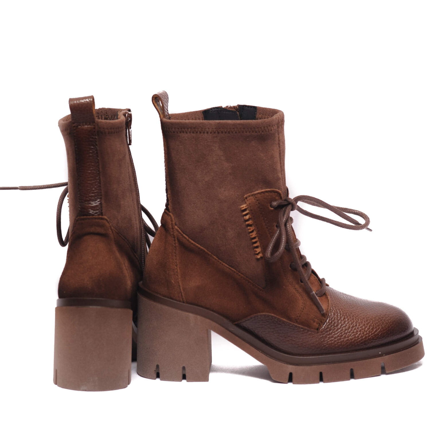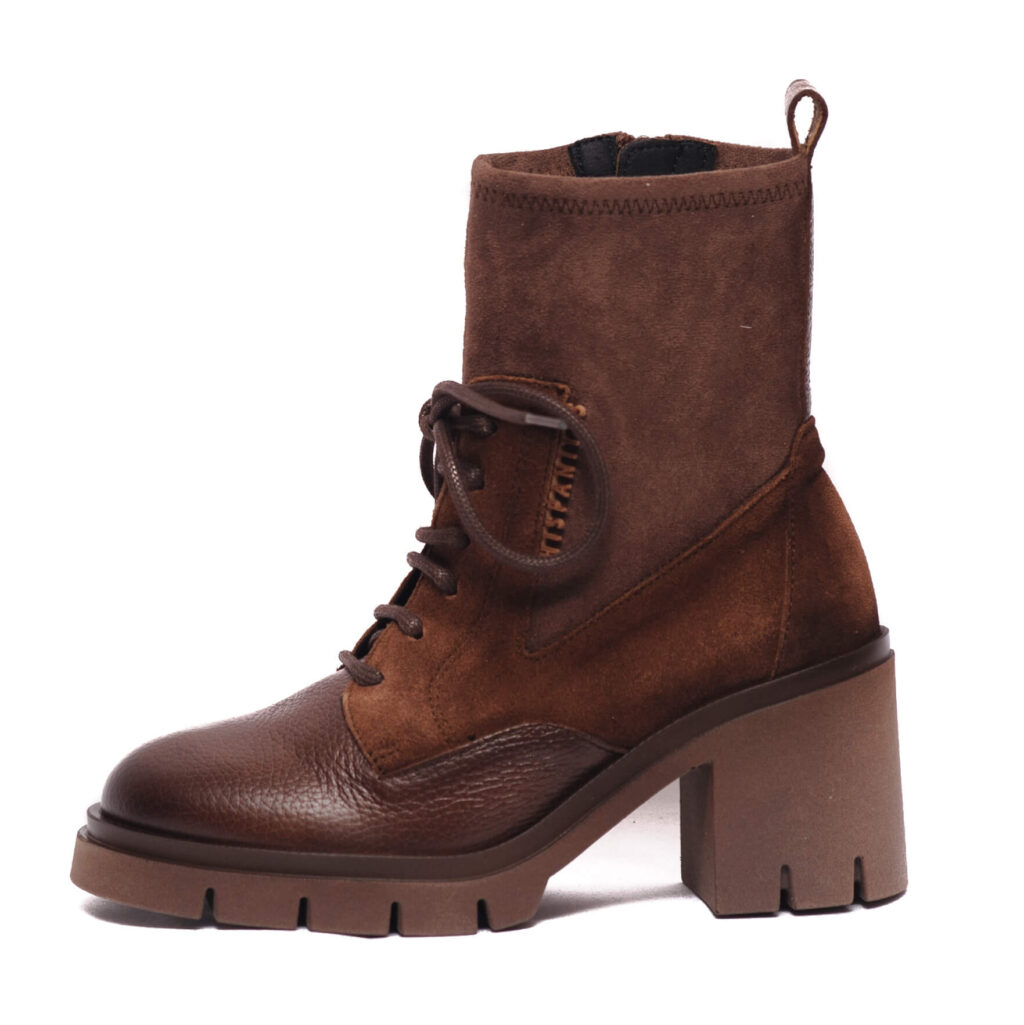 Γυναικεία δερμάτινα μποτάκια με ψηλό τετράγωνο τακούνι και υφασμάτινη ελαστική κάλτσα της Hispanitas.