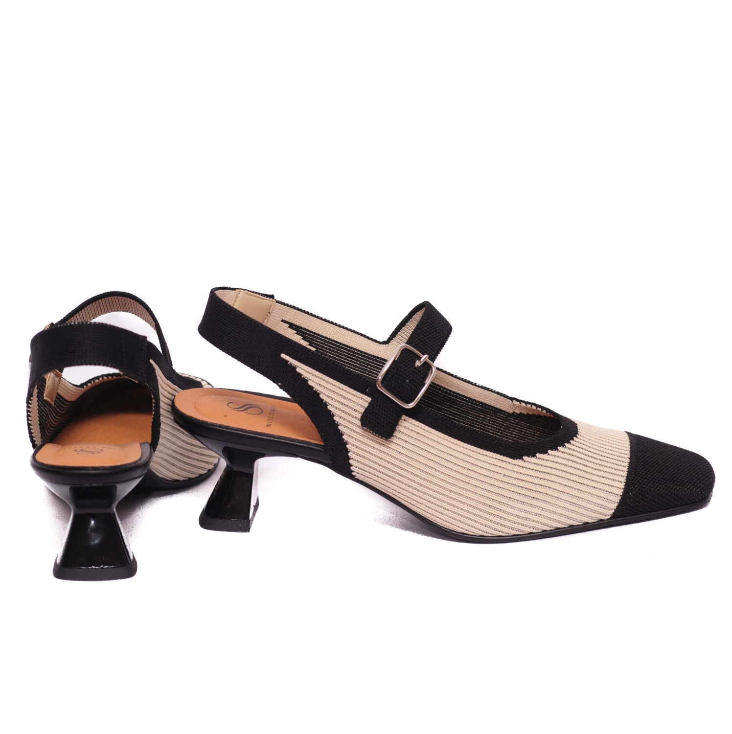 Εντυπωσιακές γόβες , με γεωμετρικό τακούνι ύψους 5.5 cm. από ρυθμιζόμενο ECO-elastic ύφασμα σε μπεζ μαύρη διχρωμία.